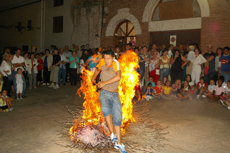A veces para entonces se hace de noche y las llamaradas iluminan el ambiente. Cuando aminora el fuego algún joven o niño se anima tras una carrera a saltar por entre las llamas. Poco a poco van creciendo el número de saltadores mientras se escucha la música al lado.